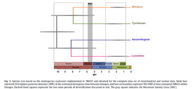 But what does all this have to do with the Messinian crisis? Here we are. Given the high genetic divergence between the species, these could have already differentiated before the Messinian crisis (5.9 – 5.3 Mya). However, these data go against the commonly accepted hypothesis that no stenoaline organism survived this period of high salinity and that therefore flora and fauna secondary recolonized the area.