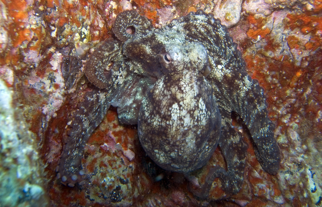 A few meters deeper and further from the coast, I managed to get a look of the common octopus (Octopus vulgaris) hiding under a rock. On the more rocky part of the sea floor, I noticed a few individuals of the zebra seabream (Diplodus cervinus cervinus) which are very common on the Canary Islands but not as much in the Mediterranean Sea. One hour into the dive, I started to play with a sole fish, or the tapaculo as Spanish people call it, but I soon left it to live calmly.