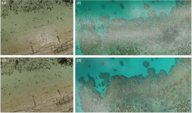 Due to an increased interest in learning how to operate drones for scientific purposes and since acquiring aerial footage is usually harder than thought, experts have written proper guidelines. Sometimes, it is necessary to work in remote locations and the available time is short, so it is essential to understand how to obtain drone-based data. One example can be seen below, where all four images represent the same locations and same time. Figures a and b are worse than c and d, but why? It is because of the sun glint and because of the fact that the first two were taken in nadir (direction pointing directly below the observer, in this case drone), whereas the second two were taken at a slight angle, minimising therefore the sun glint.