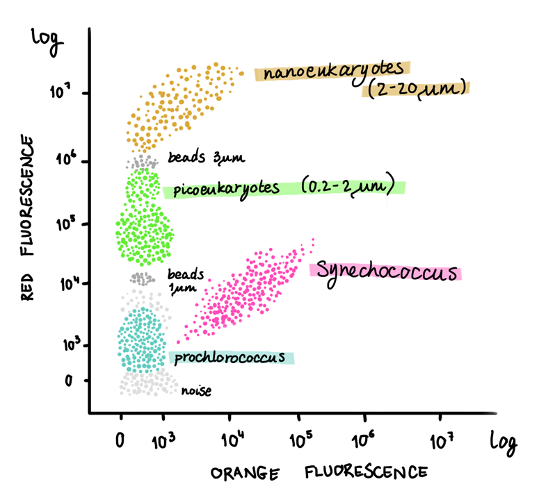 So when we observe a cloud of particles emitting a wavelength of 690 nm, they are releasing red fluorescence typical of chlorophyll a. On the other hand, when we observe a cloud of particles emitting a wavelength of 610 nm, they are releasing orange fluorescence typical of phycoerythrin. We are thus able to separate Prochlorococcus from Synechococcus, respectively. If we were to have more red fluorescence clouds of particles, however, we would have to look at cell size properties, such as the forward scatter (cell size) and side scatter (cell shape), which are essentially the “shadow” properties of the particles within a water sample. By doing so, we can detect bigger-sized cells like picoeukaryotes and nanoeukaryotes, bearing in mind they do not contain phycobilisomes like Synechococcus does.