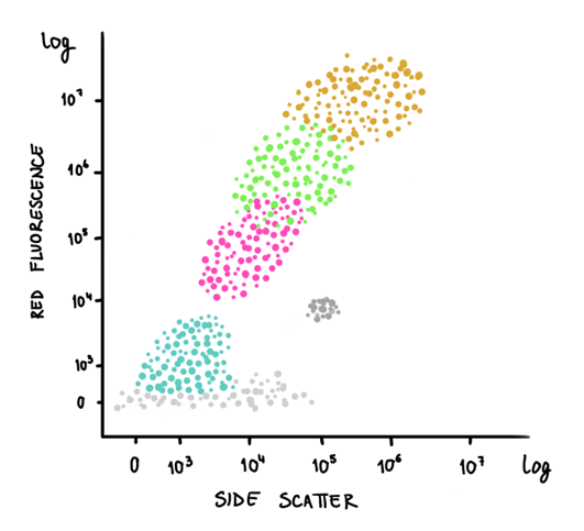 Drawings of a cytogram (dot plot from flow cytometry) representing distinct marine phytoplankton populations based on the orange fluorescence (~ phycoerythrin) versus the red fluorescence (~ chlorophyll a) on the left, and side scatter (~ cellular complexity) and red fluorescence on the right. Illustration by: Aja Trebec