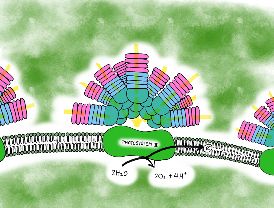 Schematic representation of Synechococcus’s phycobilisome that consists of phycoerythrin (pink), phycocyanin (light blue) and allophycocyanin (turquoise) subunits. These channel light (yellow arrows) toward the photosystem II, which reacts with water to produce oxygen, hydrogen ions and electrons for the following light reactions. Illustration by: Aja Trebec