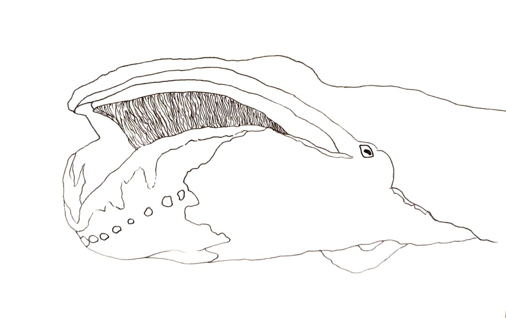 The bowhead whale has a filter-feeding system called ballen. In fact, its baleen is the longest among the rest of baleen whales. By letting a high amount of water into the mouth, the bowhead whale then closes the baleen and compresses the water out, trapping small animals such as krill. Baleen is made of keratin, a fibrous structural protein, that is found also in our hair, nail and skin.